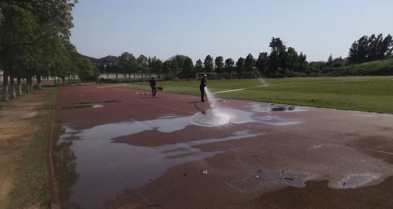 5月初學(xué)校舉辦了第三屆田徑運(yùn)動(dòng)會(huì),根據(jù)運(yùn)動(dòng)會(huì)項(xiàng)目對(duì)場(chǎng)地的要求,清理修復(fù)場(chǎng)地外排水溝;清理了跳遠(yuǎn)沙坑,重新填滿(mǎn)新沙;清理跑道上淤泥,沖刷、修補(bǔ)跑道,重新施劃跑道標(biāo)線(xiàn)與標(biāo)識(shí);修剪比賽場(chǎng)地及周邊的草坪;配合組委會(huì)在操場(chǎng)上為團(tuán)體操表演打點(diǎn)定位、搬運(yùn)功放設(shè)備和桌椅,布置主席臺(tái)、準(zhǔn)備礦泉水等,保障比賽圓滿(mǎn)完成。賽后恢復(fù)場(chǎng)地,搬運(yùn)設(shè)備、桌椅,保證正常的教學(xué)和運(yùn)動(dòng)場(chǎng)地需求。