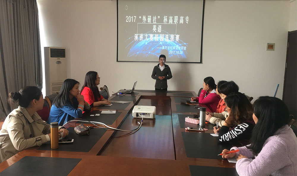 為激發(fā)同學(xué)們學(xué)習(xí)英語(yǔ)的熱情,提高同學(xué)們英語(yǔ)口語(yǔ)水平,選拔出具有優(yōu)秀英語(yǔ)演講才能的學(xué)生參加省賽,我校舉辦“外研社”杯英語(yǔ)演講比賽校內(nèi)選拔賽,本次獲勝者可參與2017年江蘇省“外研社”杯英語(yǔ)演講比賽。比賽于10月20日下午在多媒體212舉行。本次比賽由英語(yǔ)教研室承辦,教研室全體教師擔(dān)任評(píng)委。