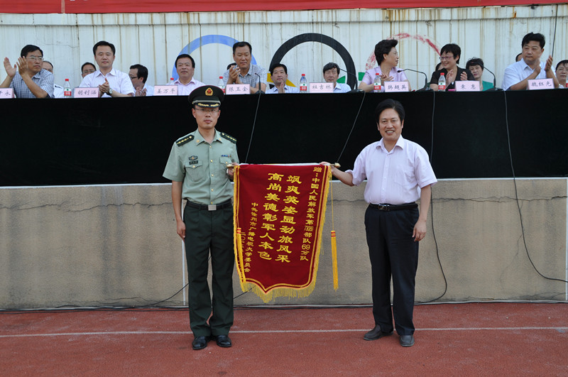 分列式結(jié)束后,黨委書記杜吉林向承訓(xùn)部隊(duì)贈送了錦旗。