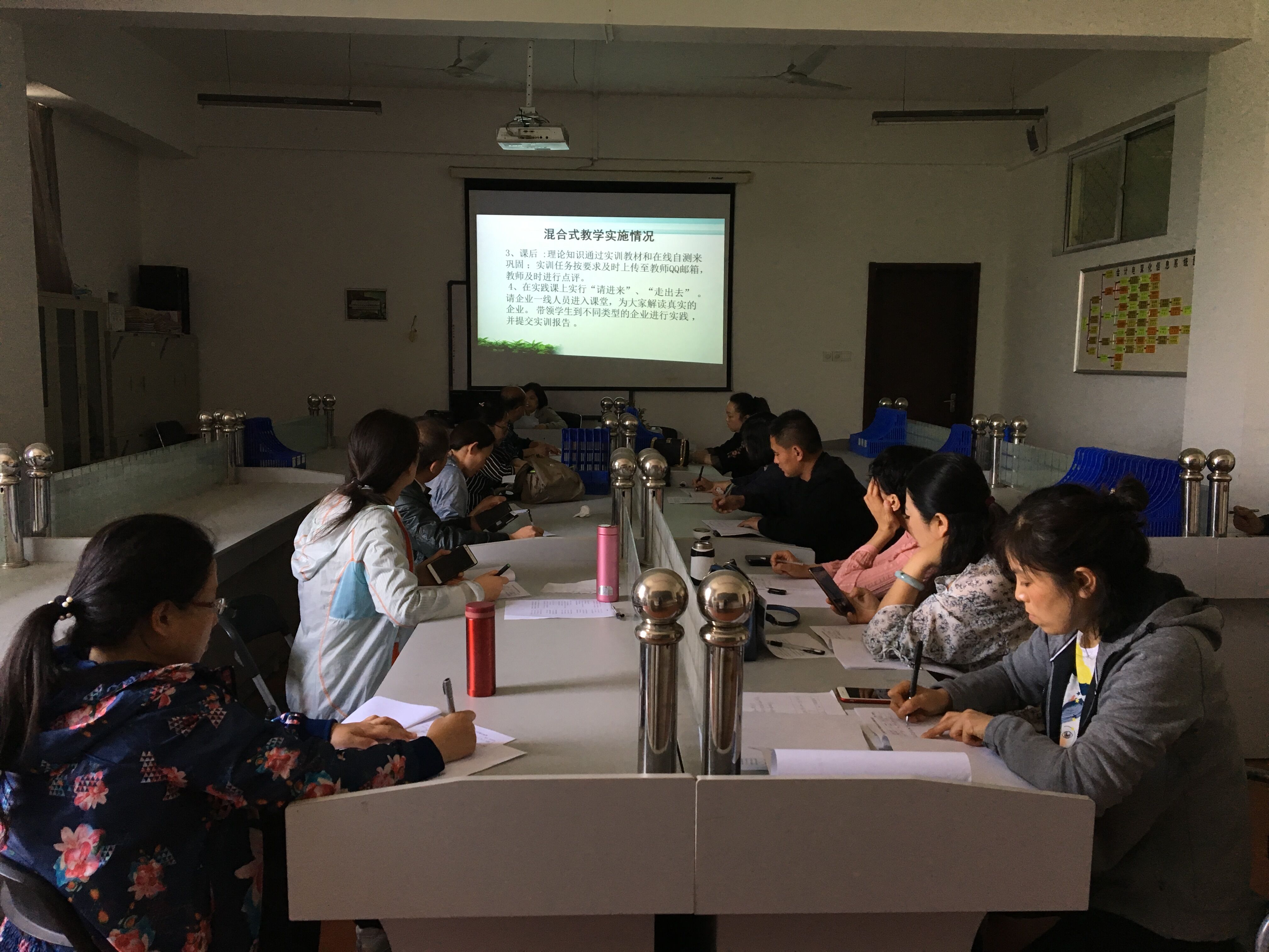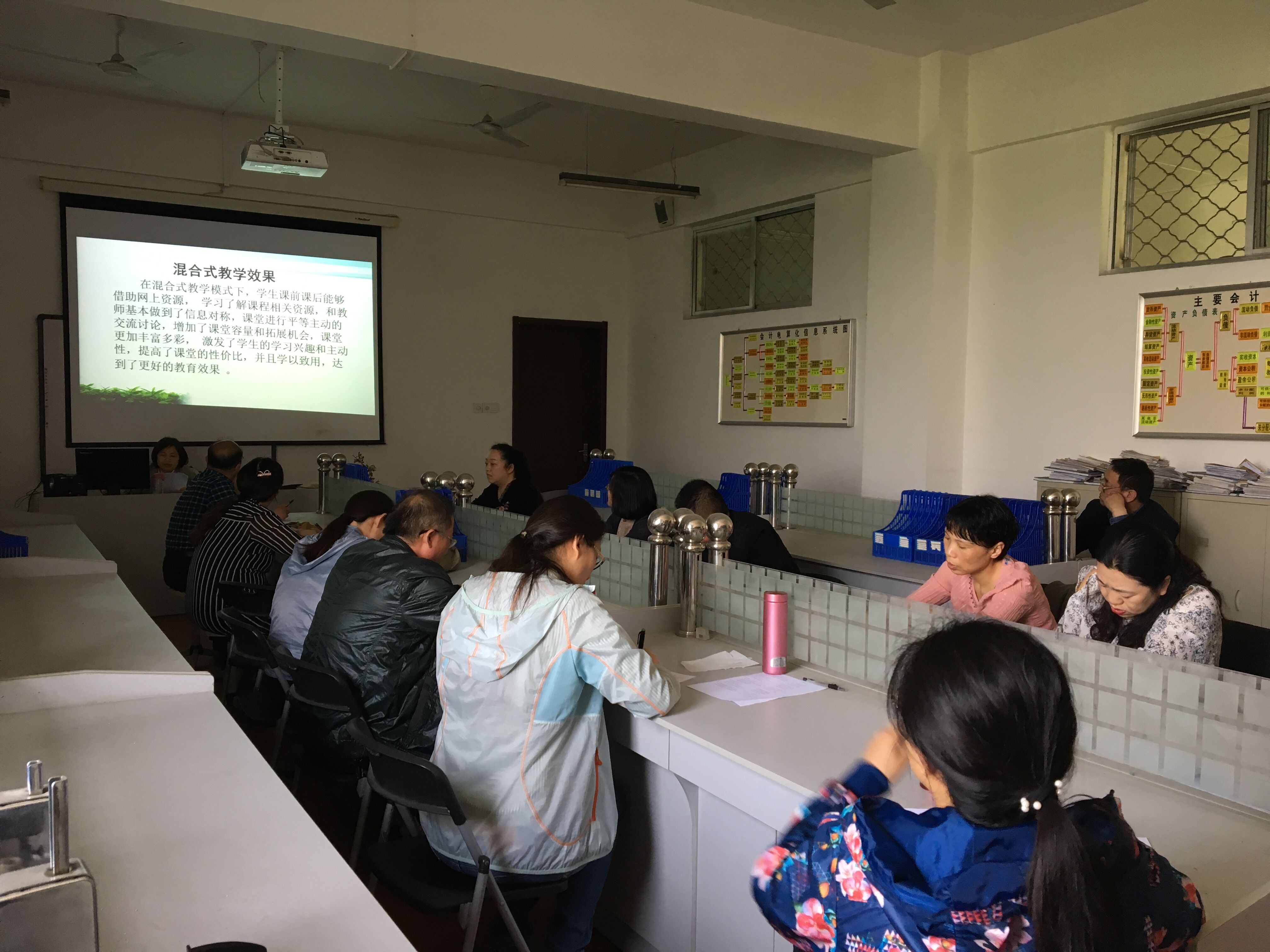 2018年4月28日下午,經(jīng)貿(mào)學(xué)院舉行了混合式教學(xué)模式專題教研活動,主要由我院杜艷卿老師介紹混合式教學(xué)模式的設(shè)計理念和實施過程,結(jié)合實際教學(xué)說明線上線下科學(xué)合理的融合,以及由此帶來的顯著教學(xué)效果。采用混合式教學(xué)模式,教師要在課前將基礎(chǔ)性的知識和比較容易的知識點放在網(wǎng)絡(luò)上讓學(xué)生提前自學(xué),主要應(yīng)用的網(wǎng)絡(luò)資源為江蘇城市職業(yè)學(xué)院學(xué)習(xí)平臺,教師自建的QQ群、微信群。在課堂上將需要實踐的理論知識和較難的知識點進(jìn)行講授與實訓(xùn),教師每節(jié)課的內(nèi)容設(shè)計采用能吸引學(xué)生、豐富多彩的教學(xué)形式,深受學(xué)生的喜愛和好評。