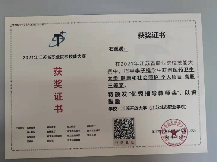 2021年江蘇省職業(yè)院校技能大賽中,指導李子祥學生獲得醫(yī)藥衛(wèi)生大類 健康和社會照護 個人項目 高職三等獎,榮獲“優(yōu)秀指導教師”。