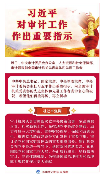 習(xí)近平強調(diào),審計機關(guān)認(rèn)真貫徹落實黨中央決策部署,依法履職盡責(zé),扎實勤勉工作,在推動黨中央政令暢通、助力打好三大攻堅戰(zhàn)、維護財經(jīng)秩序、保障和改善民生、推進黨風(fēng)廉政建設(shè)等方面發(fā)揮了重要作用。審計是黨和國家監(jiān)督體系的重要組成部分。審計機關(guān)要在黨中央統(tǒng)一領(lǐng)導(dǎo)下,適應(yīng)新時代新要求,緊緊圍繞黨和國家工作大局,全面履行職責(zé),堅持依法審計,完善體制機制,為推進國家治理體系和治理能力現(xiàn)代化作出更大貢獻。