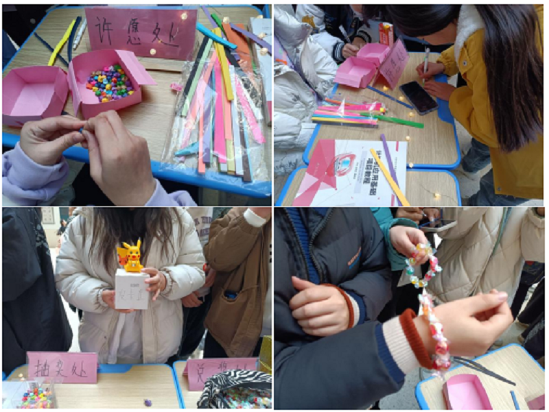 我校各班心協(xié)干事在星星紙上寫下心愿與祝福,并折成一顆顆小星星送給參與活動的學(xué)生,將心協(xié)的祝福帶給他們。星星紙上會有設(shè)定好的“暗語”,抽到相應(yīng)的“暗語”就代表會收獲額外的小禮品一份。不同的“暗語”也代表著不同的小禮品。本次活動的禮品品類繁多,有氣球、彩糖手串、各種動漫玩偶等。參與活動的學(xué)生也可以將自己的愿望或?qū)e人的祝福寫在折紙上,由心協(xié)干事折成小星星放入許愿瓶中,為學(xué)生貯存著心愿和祝福,見證著學(xué)生們夢想成真的一天。