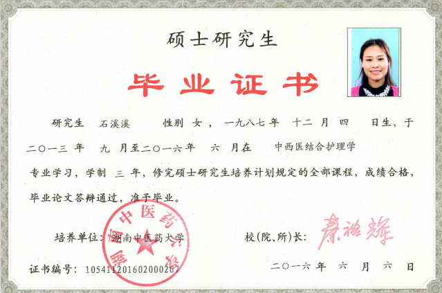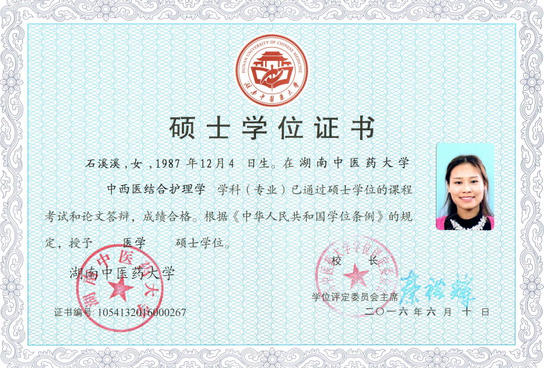 石溪溪,女,31歲,中共黨員,畢業(yè)于湖南中醫(yī)藥大學(xué),中西醫(yī)結(jié)合護(hù)理學(xué)碩士,助教,護(hù)師,醫(yī)養(yǎng)結(jié)合師,高級養(yǎng)老護(hù)理員,從事護(hù)理臨床3年,曾任醫(yī)院團(tuán)委副書記,湖南省護(hù)理學(xué)會干事,兼職《當(dāng)代護(hù)士》雜志編輯工作。主要學(xué)術(shù)方向?yàn)?ldquo;護(hù)理教育、老年護(hù)理”。公開發(fā)表論文26篇,參與《中醫(yī)特色護(hù)理技術(shù)與應(yīng)用》、《中醫(yī)健康管理規(guī)范》與《老年服務(wù)禮儀與實(shí)務(wù)》的編撰工作,參與課題13項(xiàng),其中部級課題1項(xiàng),省級課題7項(xiàng),市級課題2項(xiàng),獲得國家級獎勵2項(xiàng),省級獎勵8項(xiàng),獲國家授權(quán)專利2項(xiàng)。
